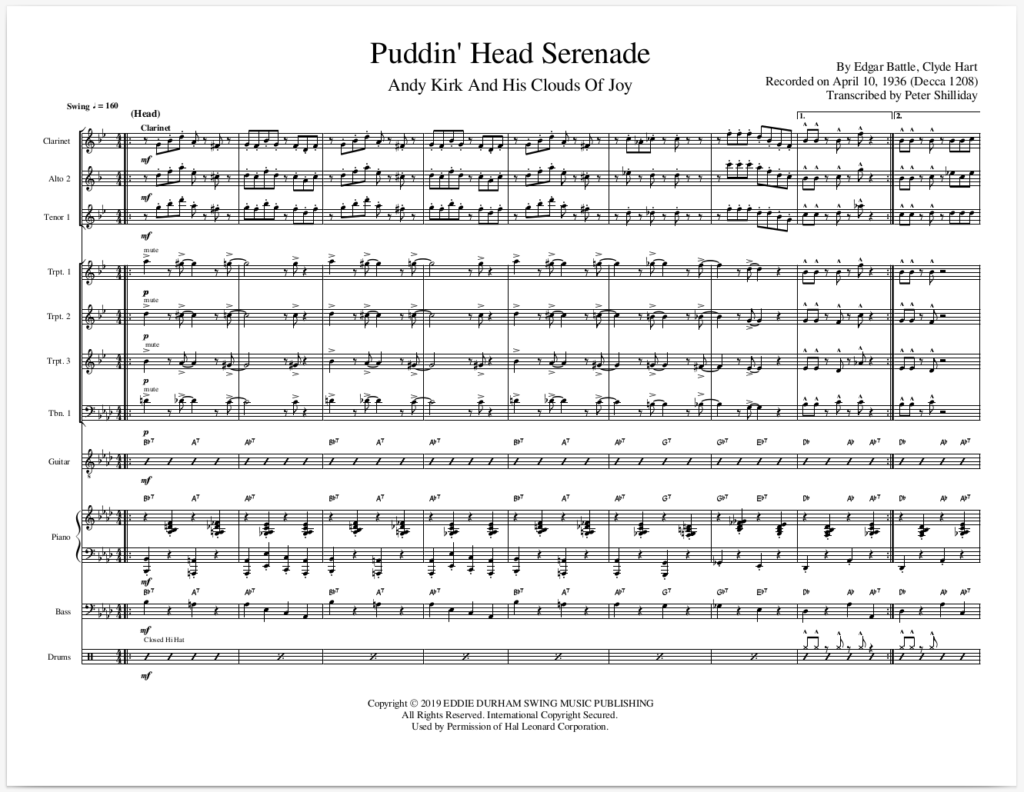 Transcriptions Puddin’ Head Serenade By Andy Kirk and His Clouds Of Joy (as recorded in 1936): Available for download at Sheet Music Plus